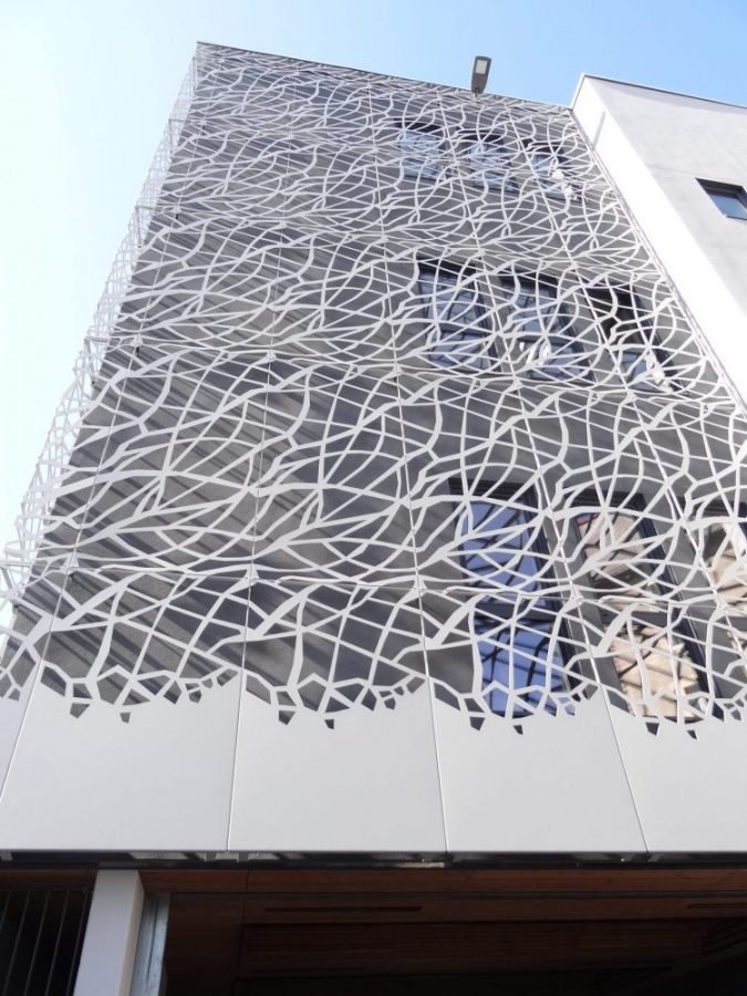 L’extension est habillée d’une résille métallique et vient en vis-à-vis du bâtiment existant pour créer le parvis d’entrée. A l’intérieur, dans les salles, la résille protège du soleil tout en préservant les vues. Le parvis créé dans l’angle des bâtiments offre une grande entrée pour les élèves et les conduit dans le préau avec son plafond bois, un espace chaleureux et accueillant.