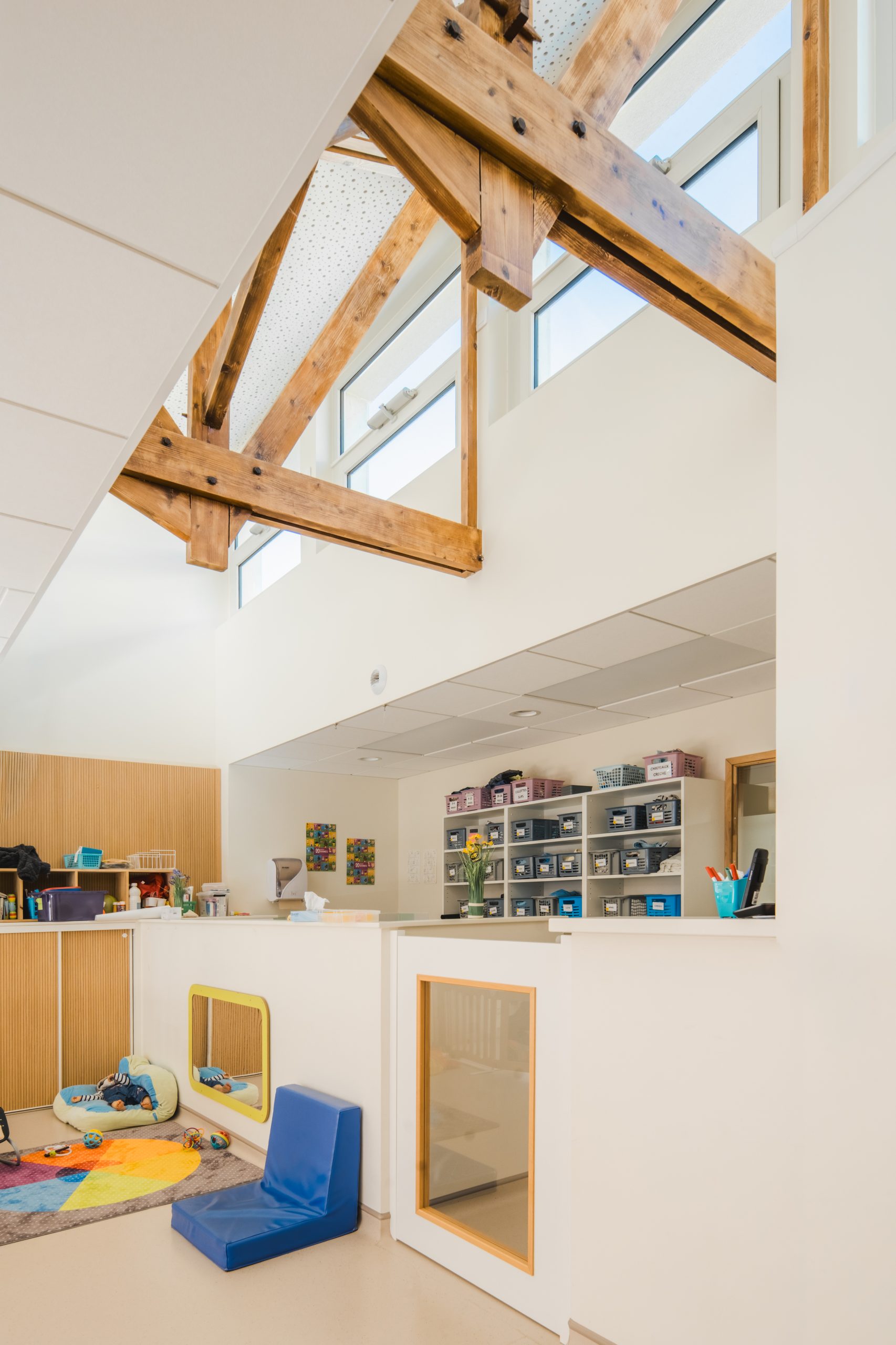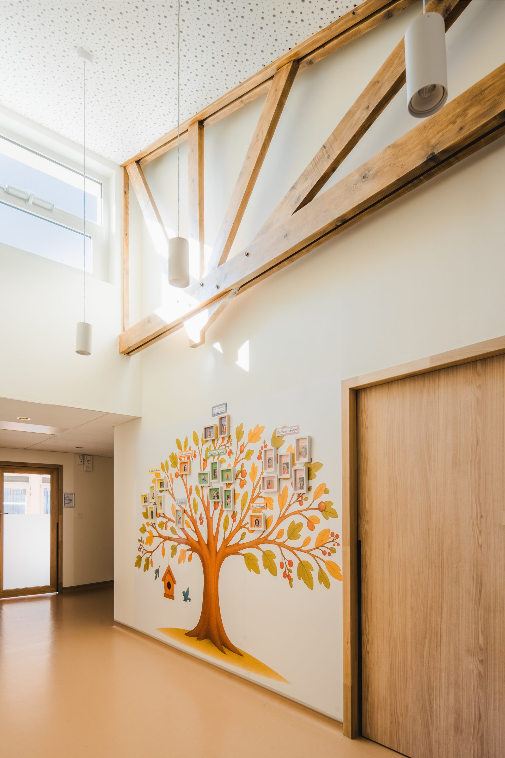 L’ensemble a été conçu dans avec des matériaux biosourcés et orientés au maximum vers l’extérieur. Ces extérieurs ont été réalisés afin d’être le plus naturel possible. Les salles de vie sont éclairées naturellement. Le mobilier a été conçu sur mesure. Le bâtiment comprend en plus des salles d’activités une salle d’éveil sensoriel avec un ciel étoilé, une salle de jeux d’eau, et une salle de motricité.
